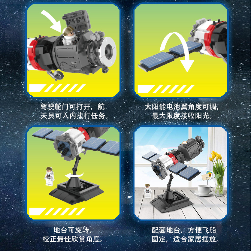 載人飛船是航天員飛向太空的專屬交通工具。蒼穹一號裁人飛船設計上沿用了中國特色載人飛船的“三艙一段”方案,即推進艙、返向艙、軌道艙和附加段。配套地臺可以手動調整最佳觀賞角度,航天員人仔可以立于地臺之上,觀賞性十足,和航天員一起進行太空探索吧!